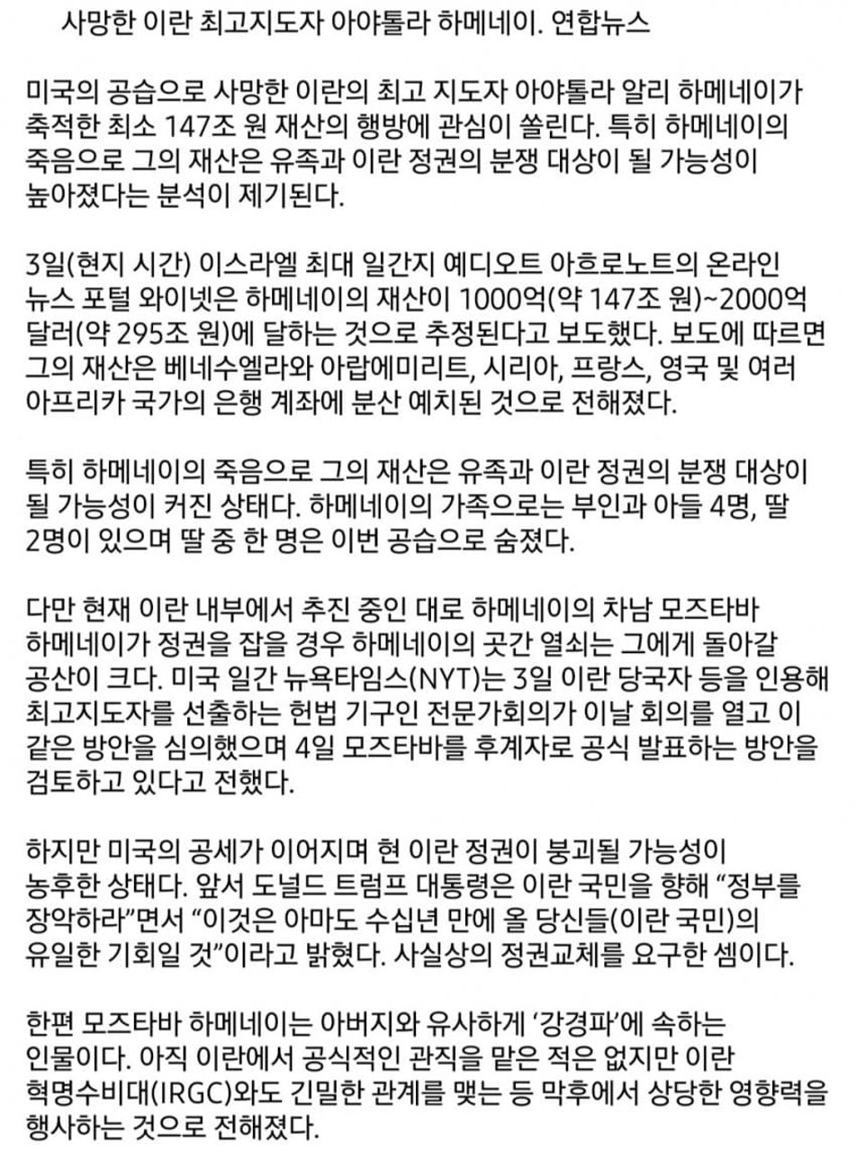 씹메네이 재산 147조 정부.유족 분쟁 전망