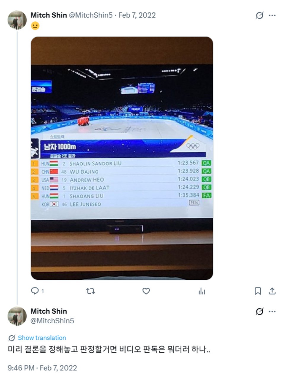 우리나라 쇼트트랙선수 실격당해서 열받으셨었나봄